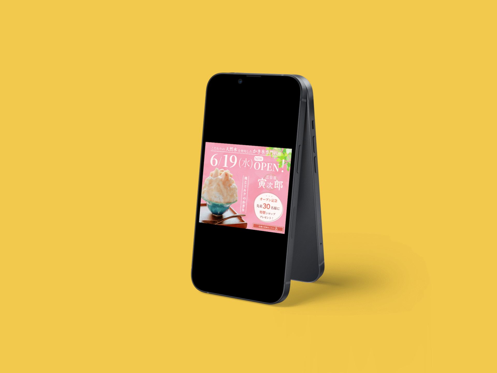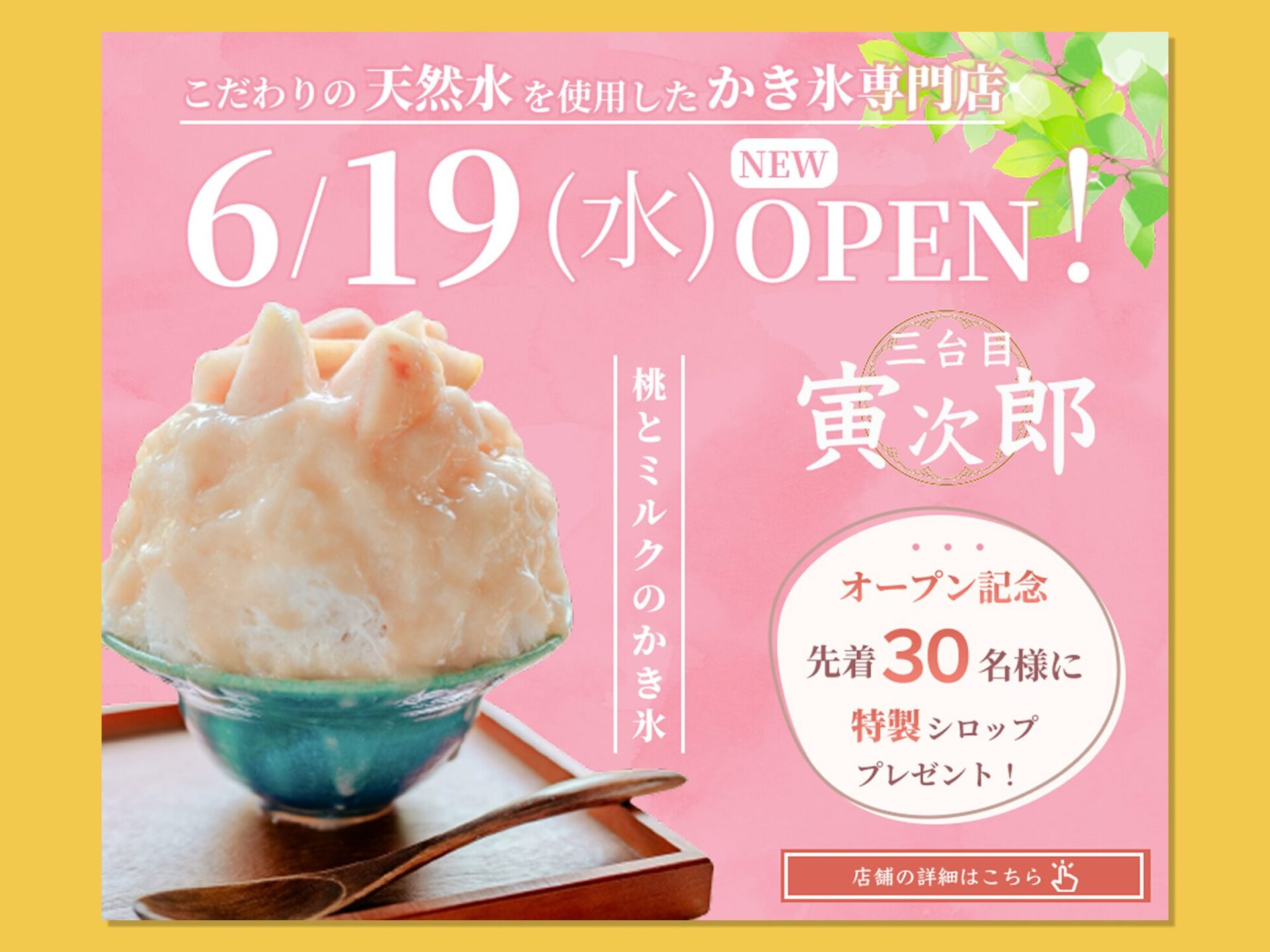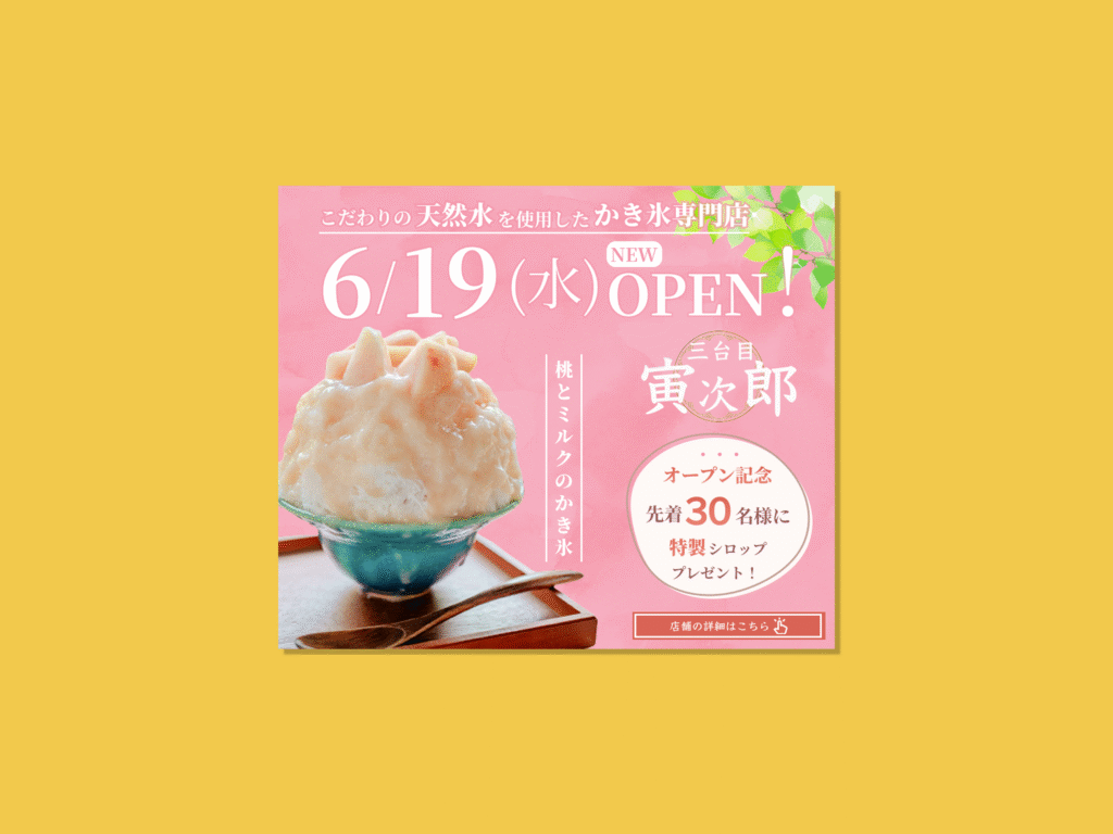 人気メニューを桃のかき氷に仮定してそちらをメインに構成組み立てました。 全体的に桃の雰囲気が伝わるカラーとあしらいとなっていてメイン画像がより映えるデザインとなっています。特典は先着順とのことだったので、オープン日が一番目立つように大きくレイアウトしました。