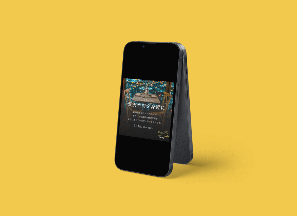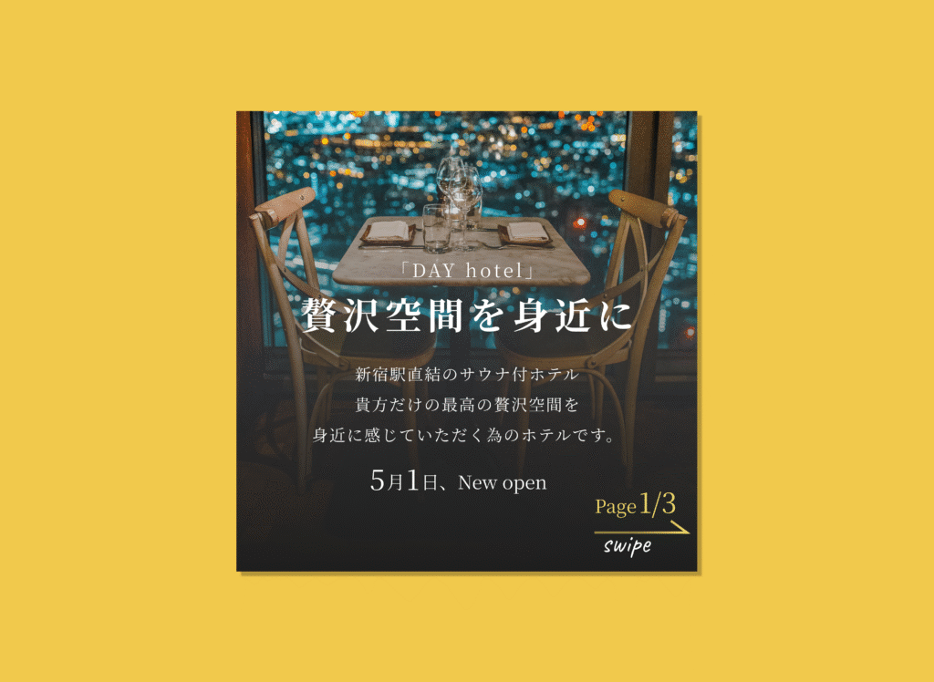 新宿駅直結のホテルということで高級感を全面に出すようなイメージで制作しました。大人空間を演出したかったのでイメージ画像を主役にし、余白たっぷりなレイアウトとなっています。表紙の画像にはグラデーション加工をし、テキストとイメージ画像が両方映えるような編集を加えています。