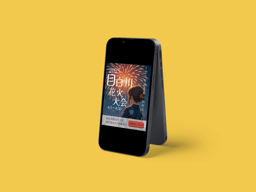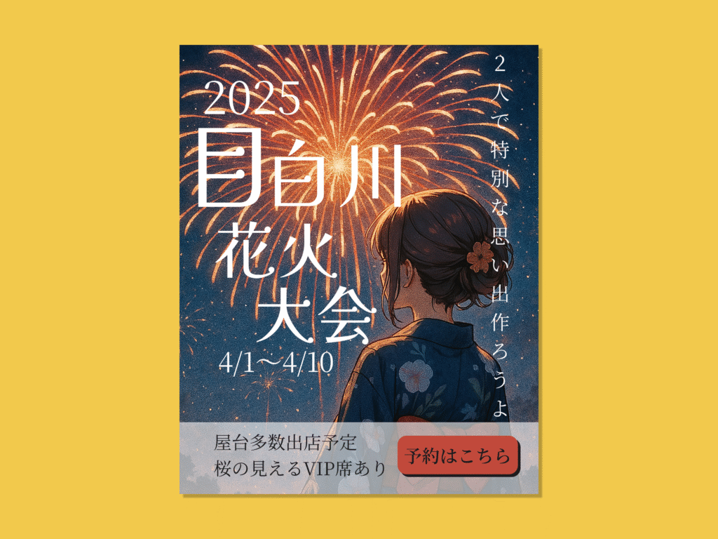 全体的にアニメ映画のようなエモさをイメージして制作させていただきました。背景画像は生成AIで制作し、見出しタイトルはあえてランダムにレイアウトすることで背景の花火とマッチした構成で制作することができました。キャッチフレーズはターゲットに一年に一度の特別な思い出を作ってほしいという思いからこちらに設定しました。