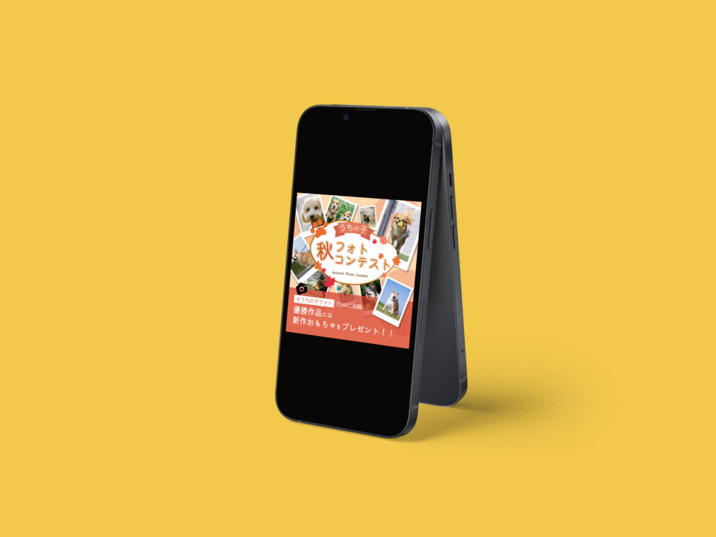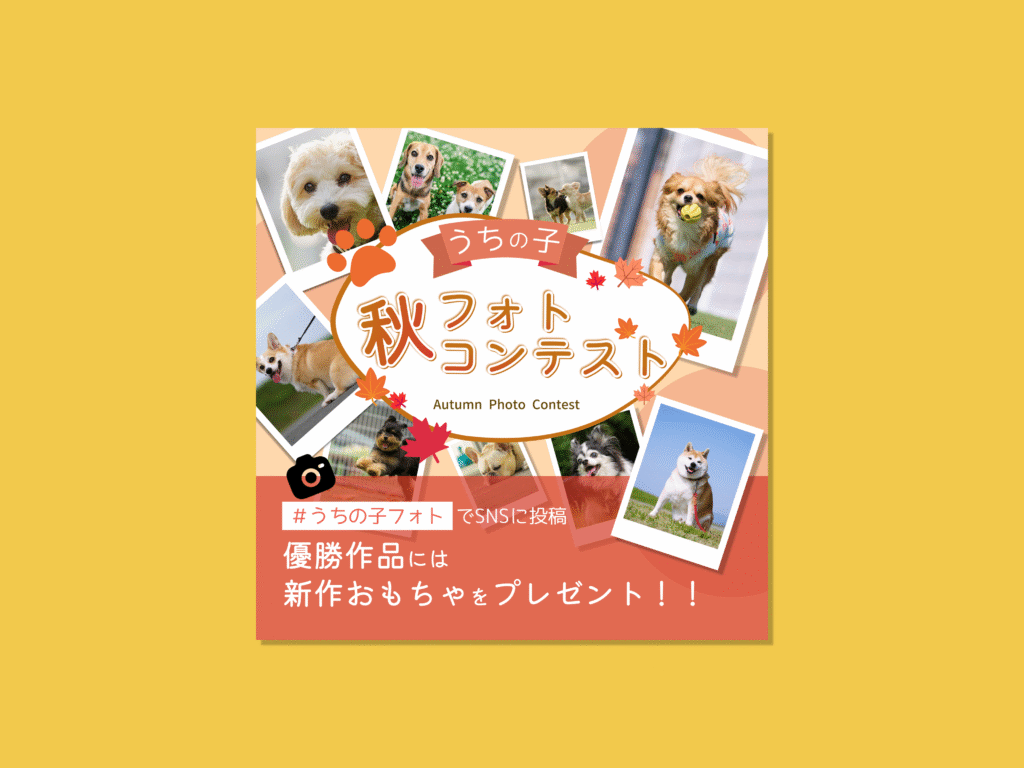 ペットのフォトコンテストと秋という2つのコンセプトをうまく掛け合わせた世界観にするため、バランスの良いカラーセットで制作しました。チェキをたくさんレイアウトする構成となっていますが、それぞれバランスよく重ねることによって程よい奥行きを感じる構成となっています。