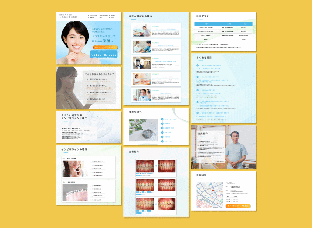 制作で意識したポイントは大きく3つとあり、ターゲットの悩みや不安を解消できるという点を全面に押し出していく 、全体的に安心感・清潔感を感じるデザインを目指す 、料金プランの不透明さを解消しインビザラインがどういったものなのかを端的にわかりやすく解説していくという点に注力しました。「爽やかで明るい未来が待っている」こちらの願いを込めた設計にしかたかったので治療後のモデルとしてメインターゲットに近いモデルを採用、キャッチフレーズはインビザラインを知らない方でも一目でわかるものに設定、今回の目的でもあるネット予約につながるボタンにはアクセントカラーを採用 ネット予約を嫌う方のために、その直下に電話予約ボタンも大きく採用した点もこだわりポイントとなっています。