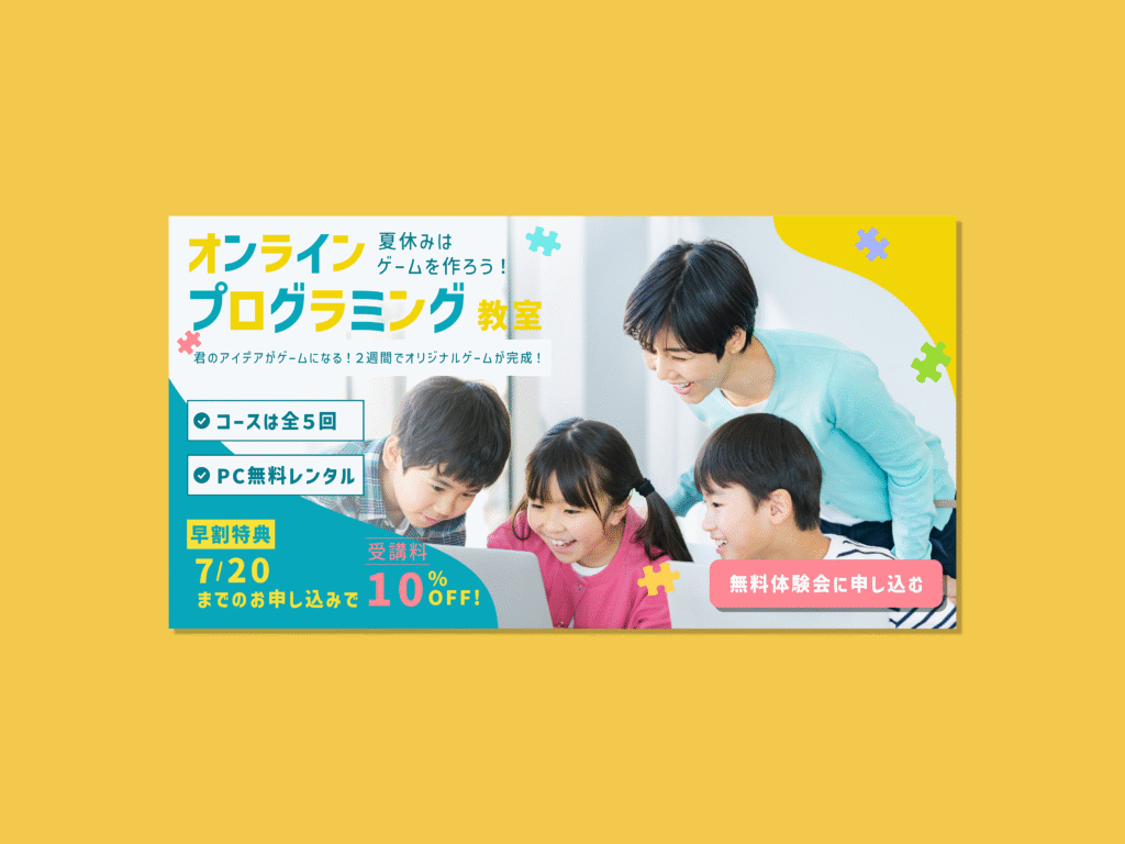 ポップなデザインというオーダーではありますが、ターゲットには中学生も含まれていて子供っぽすぎるデザインにはしたくなかったのでカラー選定などは慎重に選びました。楽しく学べるスクールというところをテーマに制作したかったので程よくパズルのピースのあしらいをレイアウトしています。